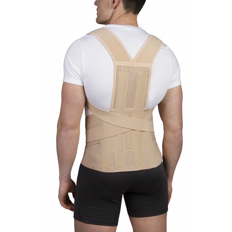 Wysoka orteza tułowia z podpaszkami wspomagającymi właściwe ułożenie (cofnięcie) ramion. Zapinana z przodu za pomocą dwóch niezależnych części dla lepszego dopasowania, zakończonych na velcro. Wykonana w technologii bezszwowej z oddychającego materiału. Bardzo lekka. Zawiera cztery fiszbiny wzmacniające oraz pelotę lędźwiową zapewniającą ocieplenie i lepsze dopasowanie do lędźwi. Wysokość części tylnej 50 cm, w części brzusznej 19 cm. Wykonana z nowoczesnego materiału nie zawierającego lateksu (hipoalergiczny).