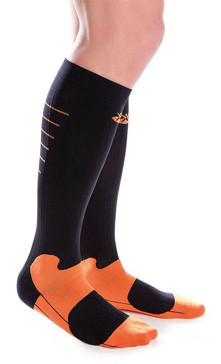 Sportowe podkolanówki kompresyjne do stosowania przez profesjonalnych sportowców jak i amatorów. Stymulują krążenie w żyłach w czasie wysiłku fizycznego redukując bolesność powysiłkową mięśni równocześnie przyśpieszając czas ich regeneracji. Utkanie materiału zapewnia utrzymanie stałej temperatury ciała podczas wysiłku fizycznego. Podkolanówki zapewniają bardzo dobra ochronę najbardziej podatnych na otarcia okolic (ścięgno Achillesa, palce, strona podeszwowa) stopy minimalizując wstrząsy powstające w czasie aktywności a strefa ochronna na grzbiecie stopy ma za zadanie minimalizować dyskomfort powstający na skutek silnego przylegania butów. SKŁAD: 72% Poliamid, 28% Lycra.