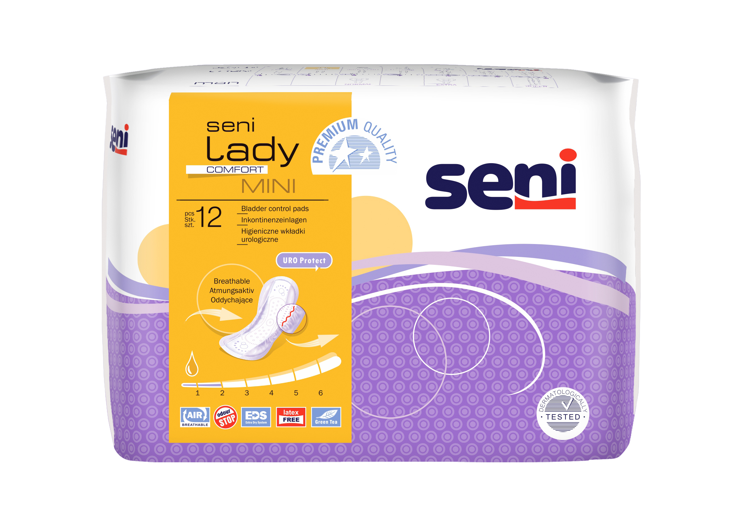 Wkładki urologiczne Seni Lady Mini przeznaczone są dla kobiet z lekkim nietrzymaniem moczu. Rozmiar Mini wielkością przypomina tradycyjną podpaskę, jednak dzięki specjalnej budowie zapewnia dużo większe bezpieczeństwo. Chłonność wkładek urologicznych jest kilkakrotnie wyższa niż chłonność zwykłych wkładek dzięki zastosowaniu superabsorbentu wzbogaconego wyciągiem z zielonej herbaty, który wiąże ciecz i neutralizuje nieprzyjemny zapach. Seni Lady Mini mają wewnętrzne osłonki boczne zapobiegające wyciekom. Osłonki wykonane są z delikatnej włókniny i elastycznej przędzy bez elementów lateksowych. Seni Lady są oddychające, dzięki czemu zapewniają swobodny dostęp powietrza do skóry. Mocowane za pomocą szerokiego paska klejowego, który skutecznie mocuje wkładkę do bielizny.