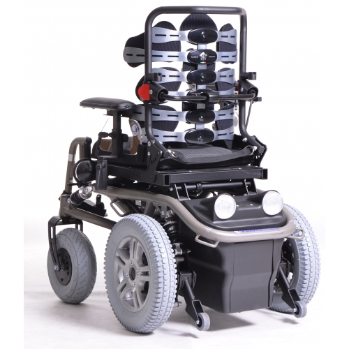 Wózek z napędem elektrycznym dla DZIECI . Fantastyczne rozwiązanie zawieszenia kół tylnych i przednich oparte na amortyzatorach z regulowanym skokiem pozwala czuć najwyższy komfort podczas jazdy w terenie. Prawdziwa frajda podczas jazdy po nierównym terenie. Bardzo interesujące zawieszenie kółek przeciw-wywrotnych na systemie ROSTA skutecznie zabezpiecza przed niebezpiecznym przechyleniem wózka w sposób dopasowujący się do wysokości pokonywanej przeszkody. Opcjonalne wózek można wyposażyć w automatyczną regulację wysokości siedziska. Osoba siedzi na wysokości 73 cm , to zapewnia kontakt wzrokowy z osobą stojącą.